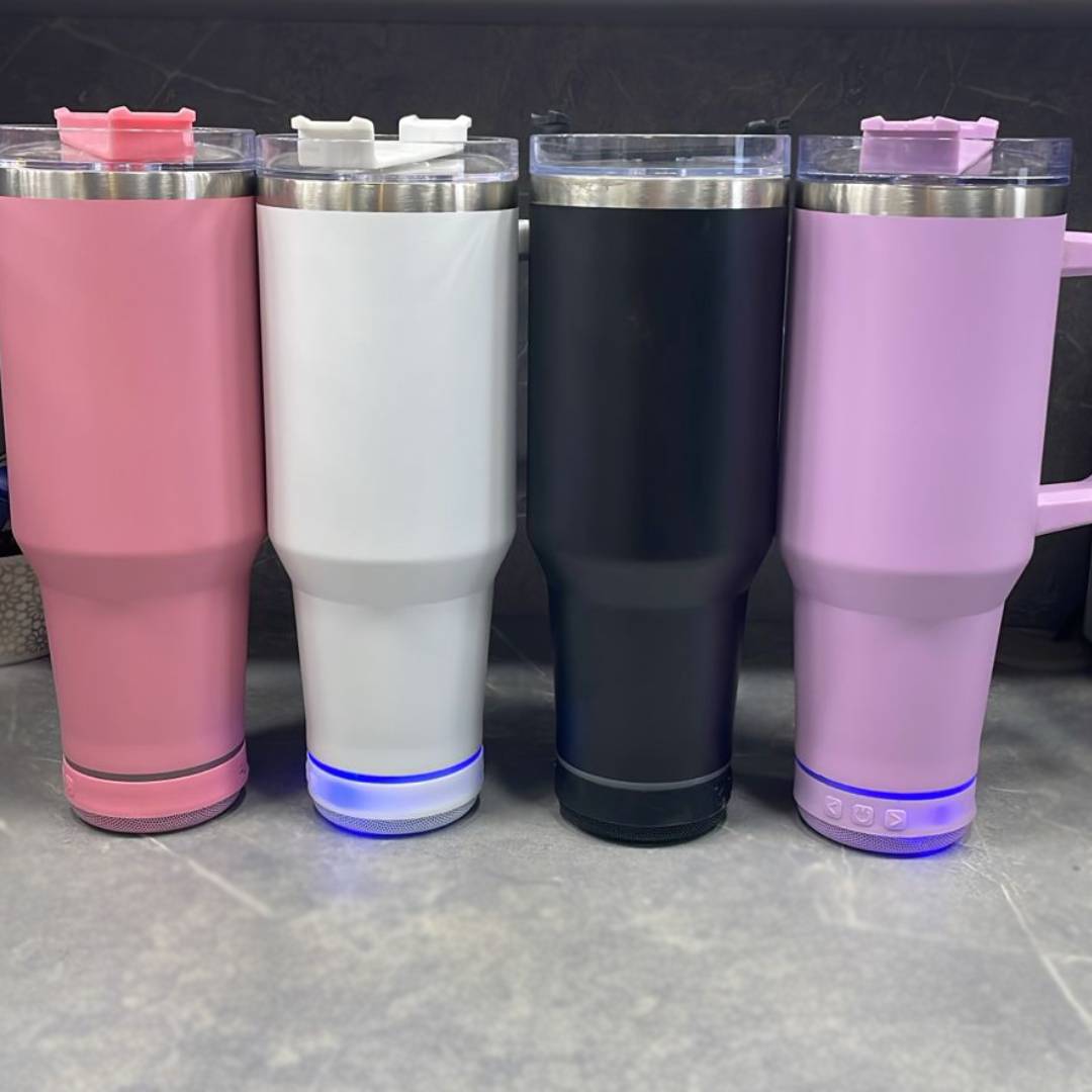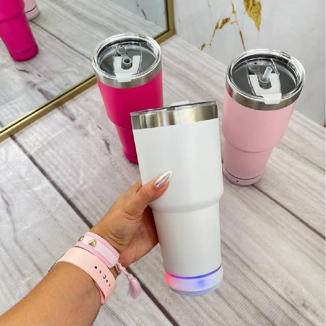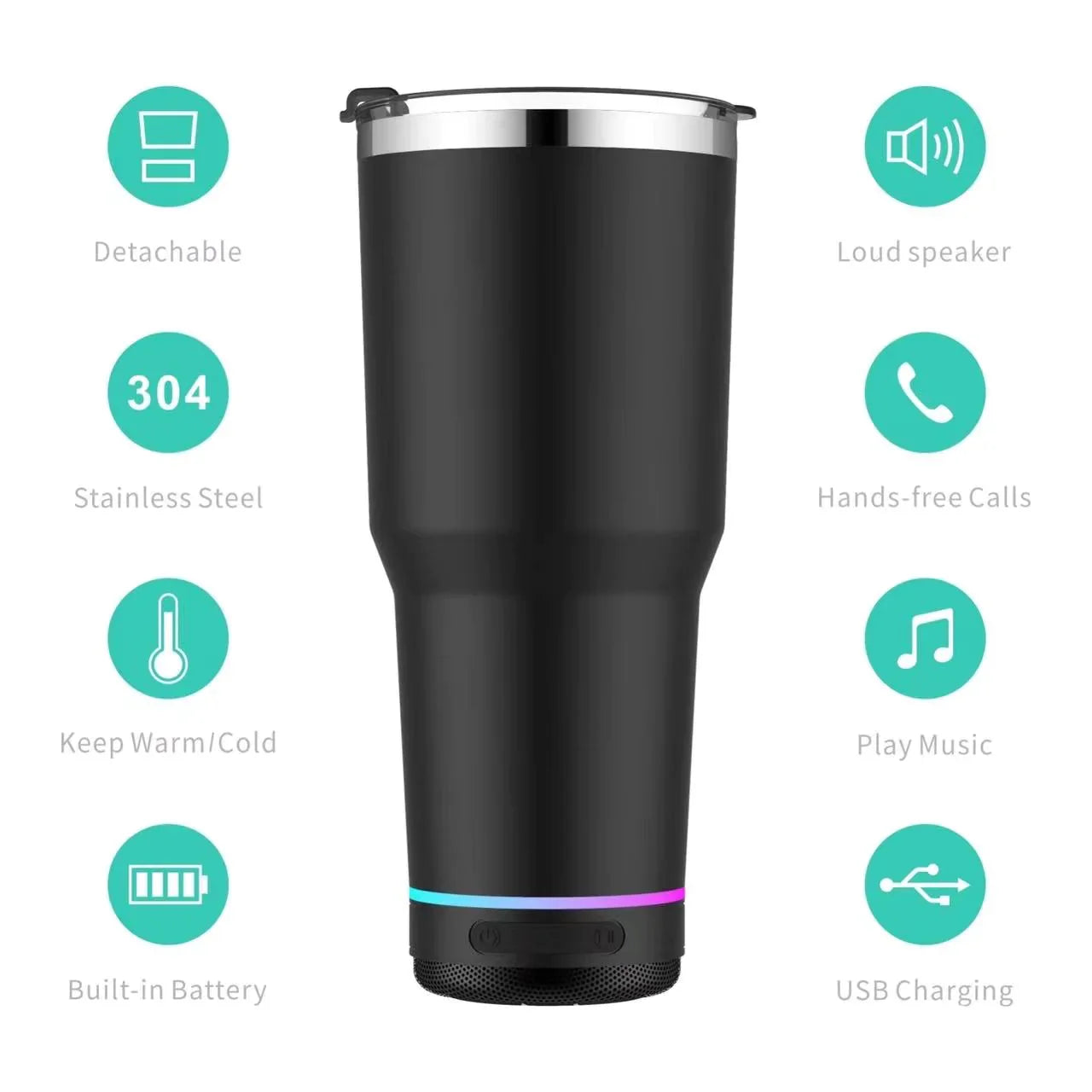 Play music straight from your cup! This 30oz Speaker Tumbler is made of stainless steel and includes a detachable Bluetooth speaker.